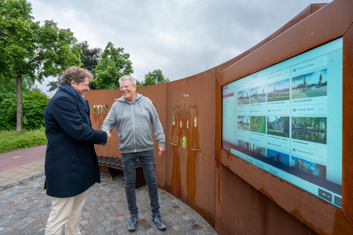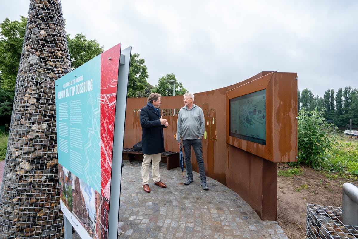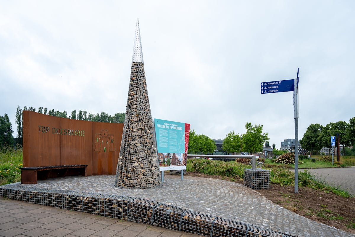 Sinds eind vorig jaar staat er een ca. 4 m hoge gazen kegel met keien erin op de Turfhaven. Met de komst van het digitale scherm in deze TOP is dit Toeristisch Overstap Punt nu afgerond en klaar voor het toeristisch seizoen. Wethouder Stan Hillenaar: “De TOP is een mooi startpunt om Doesburg of de omgeving te voet of met de fiets te verkennen. Het digitale informatiescherm met wat er allemaal in Doesburg te beleven is, is een echte aanwinst. We zijn Achterhoek Toerisme dan ook erg dankbaar voor het plaatsen van deze TOP in Doesburg."